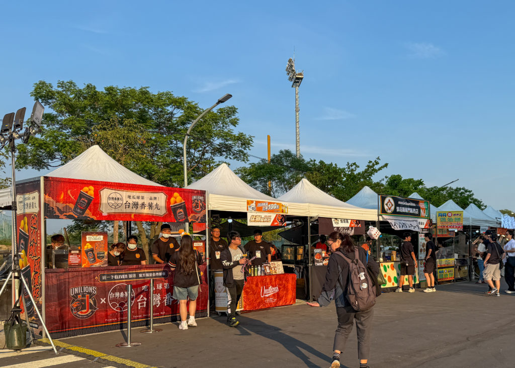 球場を正面にして左側、テントが立ち並ぶエリアには、台湾らしい屋台が数件出店しています。台南球場にもあったサツマイモボールのお店もあり、ちょっとしたローカル感も楽しめます。